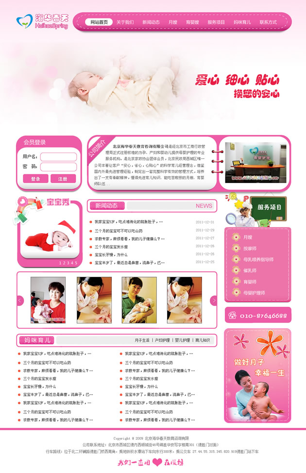 北京海華春天教育咨詢有限公司是經(jīng)北京市工商行政管理局正式注冊核準(zhǔn)的為孕、產(chǎn)婦和嬰幼兒提供母嬰護(hù)理的專業(yè)服務(wù)機(jī)構(gòu)。是北京家政協(xié)會(huì)團(tuán)體會(huì)員,北京民政局西城區(qū)唯一月嫂合作伙伴。