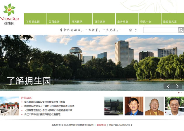 北京擁生園投資管理有限公司隸屬于萬禾投資,是一家專項投資于文化陵園連鎖經營的私募基金管理公司。公司總部位于北京。公司擁有專業的園林設計施工及陵園管理團隊,并與國家民政部、宗教界有良好的合作關系……