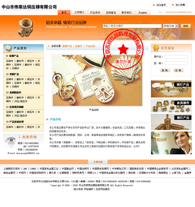 中山市偉榮達銅壓鑄有限公司位于著名的中國五金產品生產基地 —— 中山市小欖鎮,是一家專業的壓鑄產品制造公司, 尤其是在銅配件及銅產品的壓鑄方面, 具有成熟的模具開發,產品壓鑄,產品后加工的能力, 在業內處領先地位……
